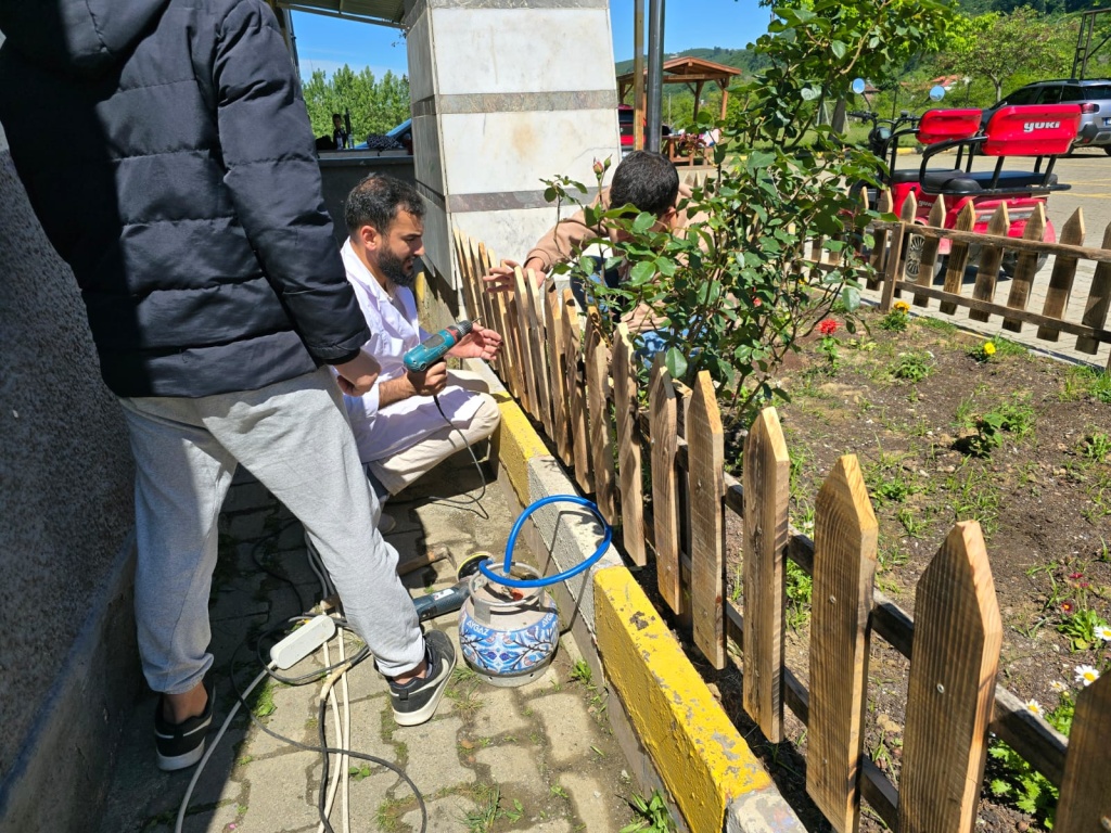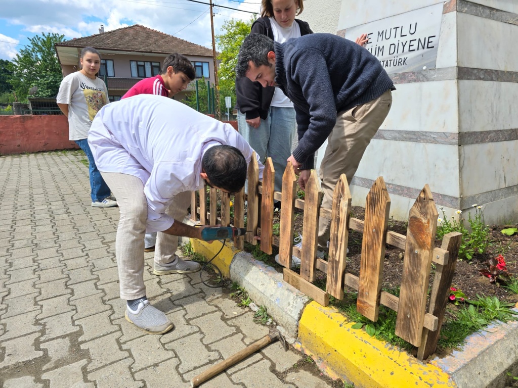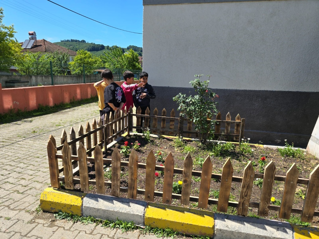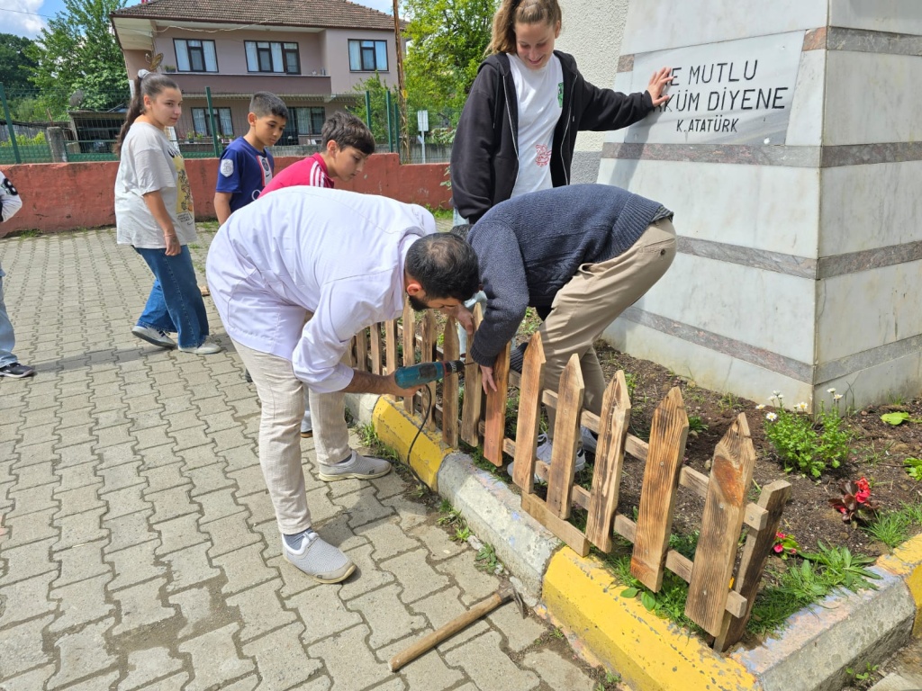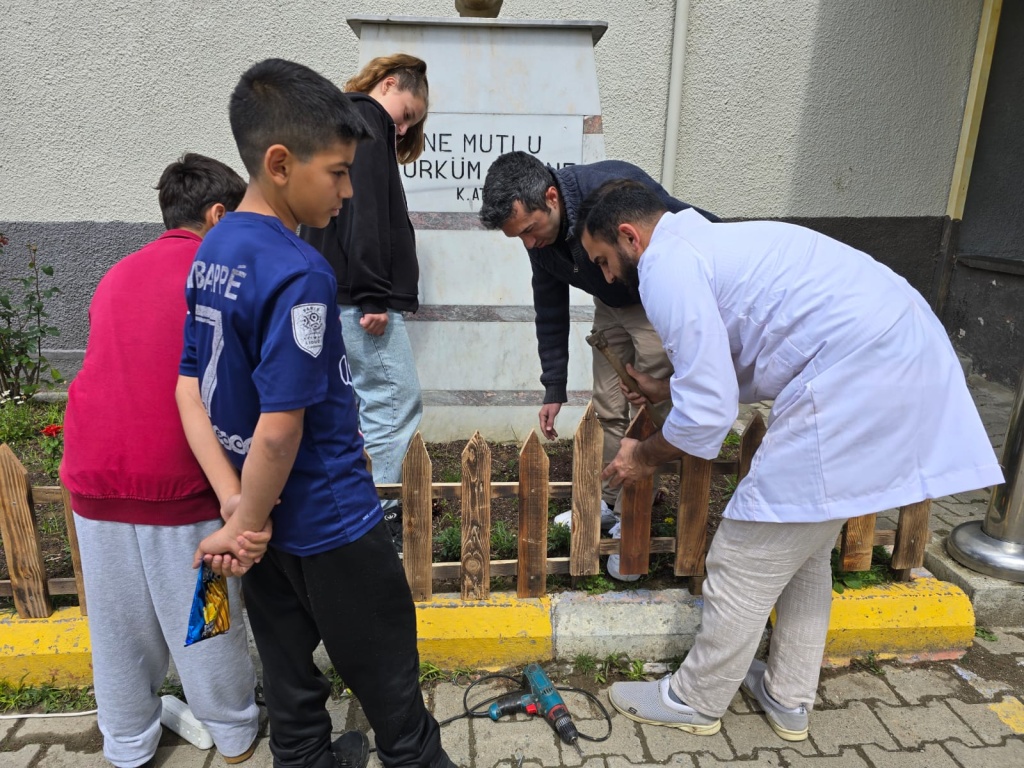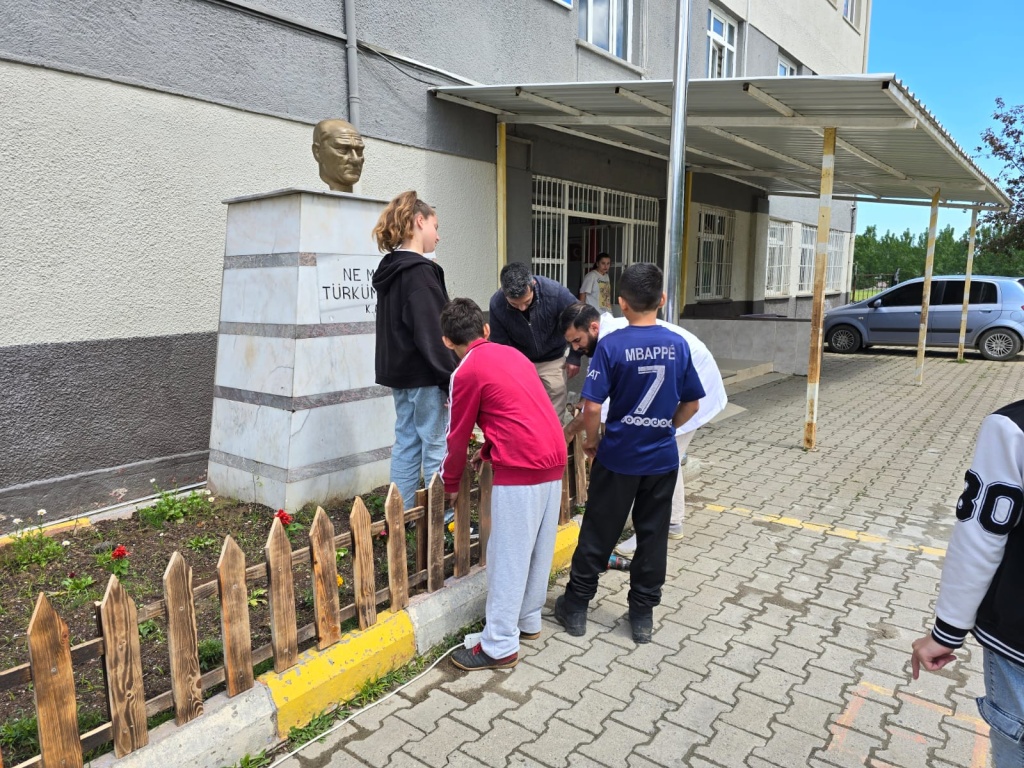 Atatürk büstümüzü çiçeklendirdik ve önlem için çit yaptık.